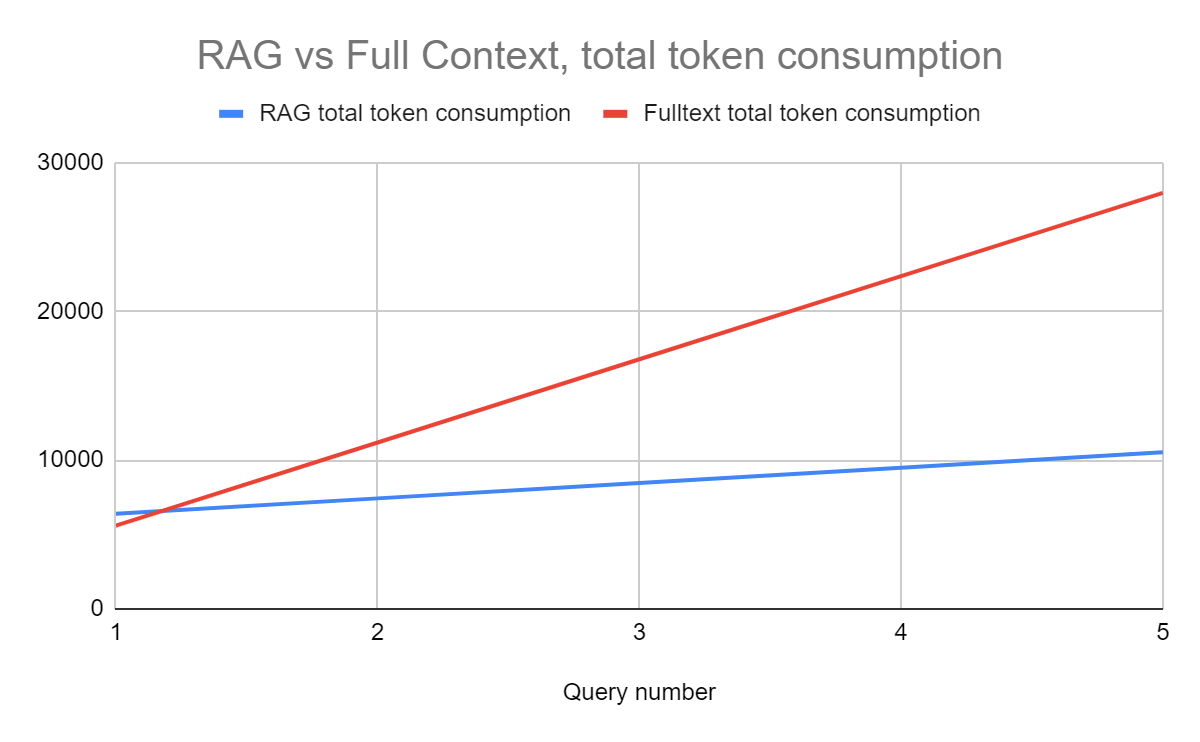 The results clearly illustrate the one-time cost of embedding a document is substantial, which makes intuitive sense. But this is for ‘query 1’; in subsequent queries that leverage the same document, doc_load_tokens reduces to zero, and consequently we may expect RAG to ‘break even’ by query N by amortizing the one-time doc_load_tokens cost. It turns out, for this experiment, RAG pays for itself by query 2.