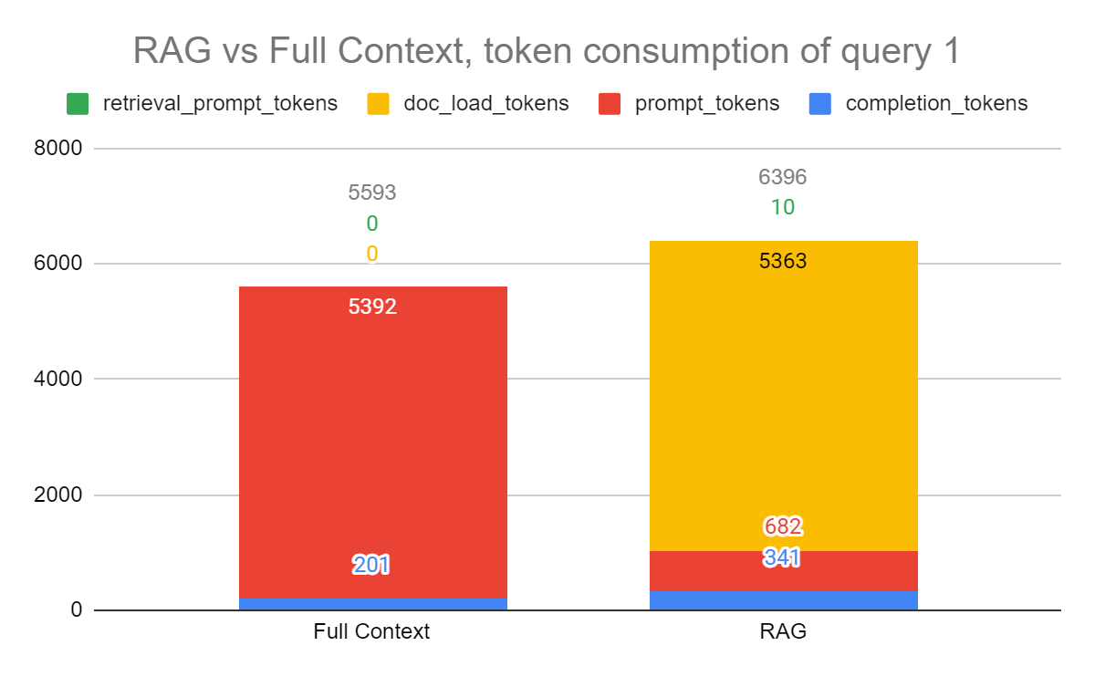 Let’s ignore 3 for now. The result of the test query was very similar for both the Full Context implementation and the RAG implementation. Taking one sample completion, the RAG implementation output was slightly longer. We tallied up the token consumption for both implementations.
